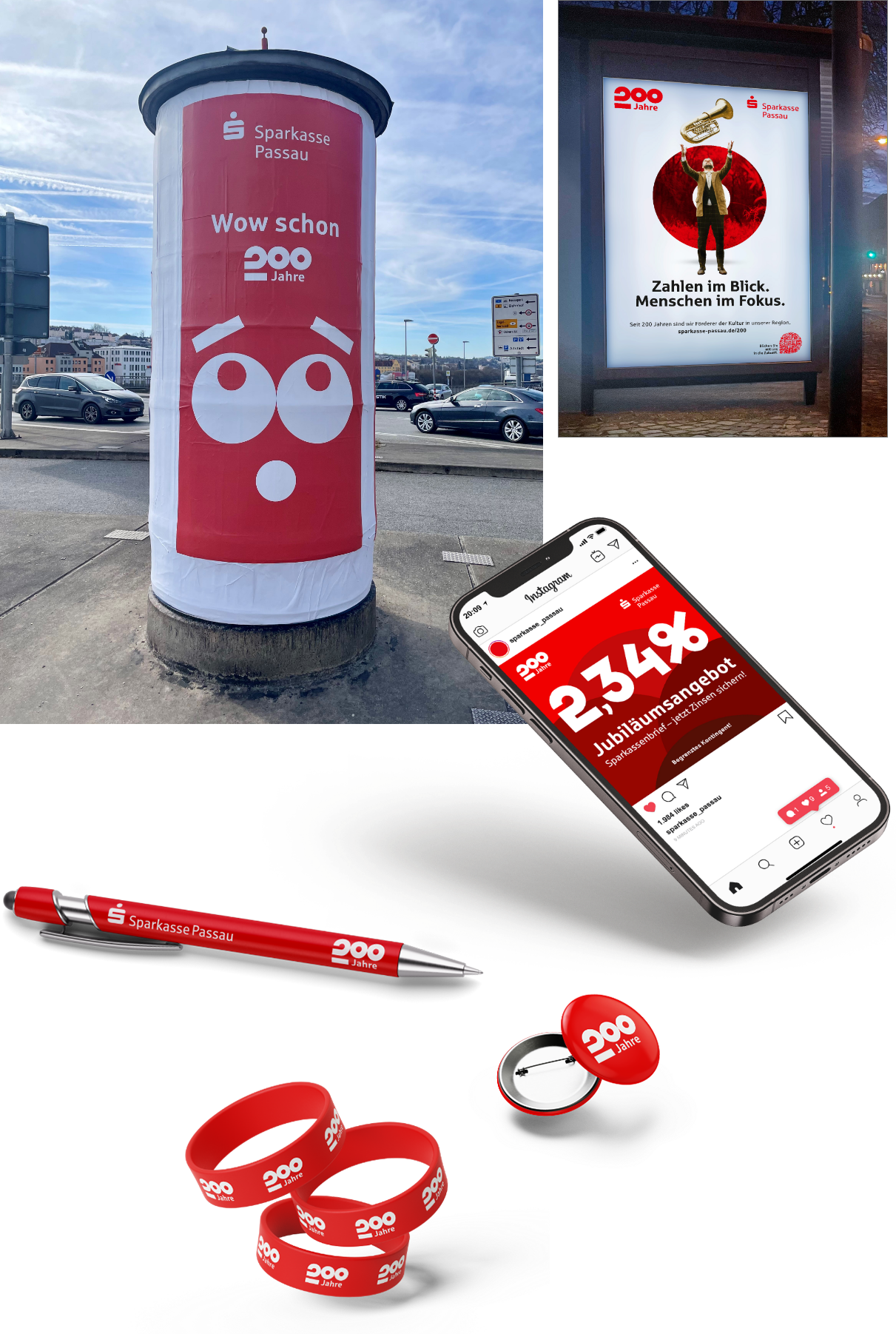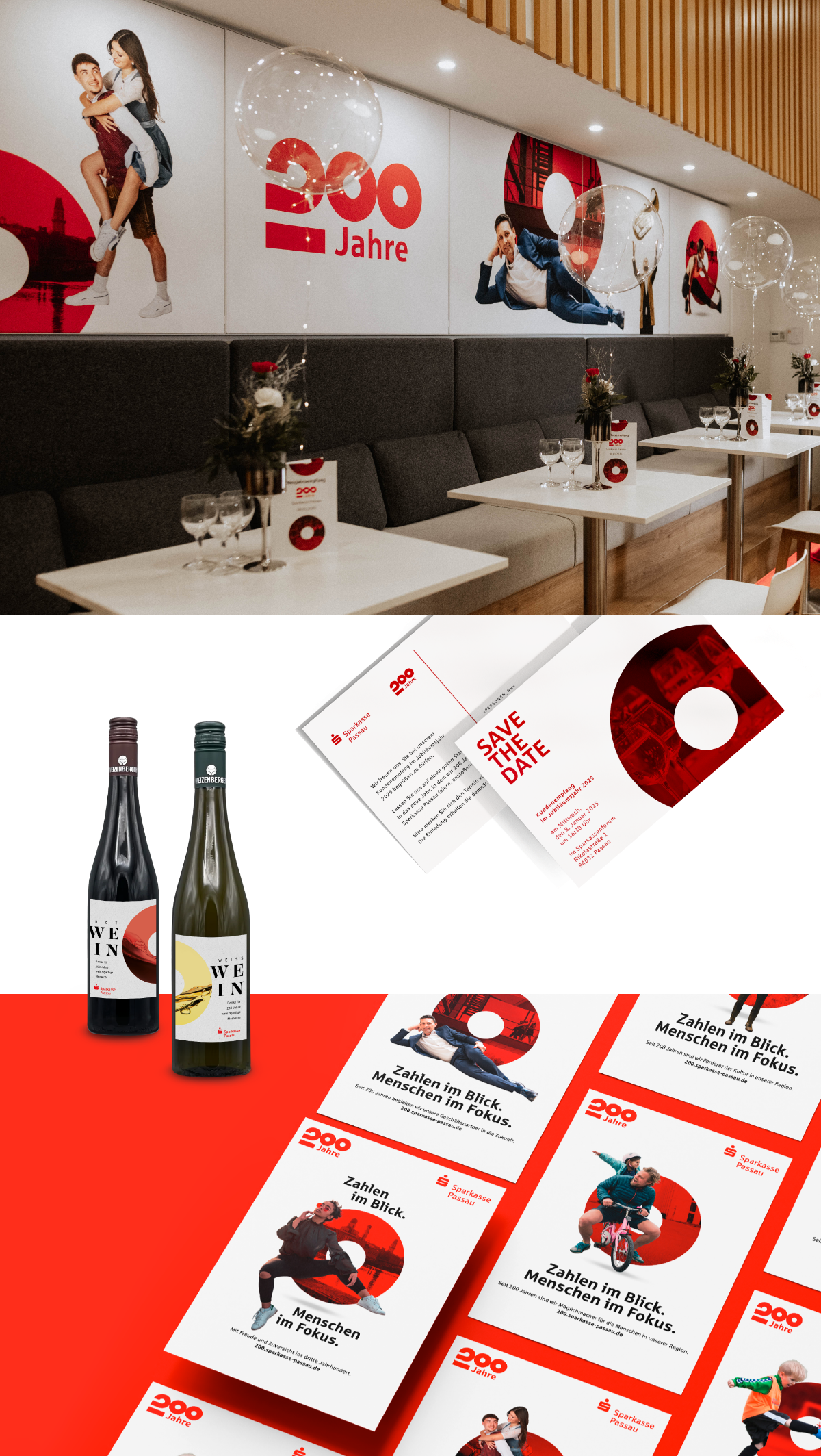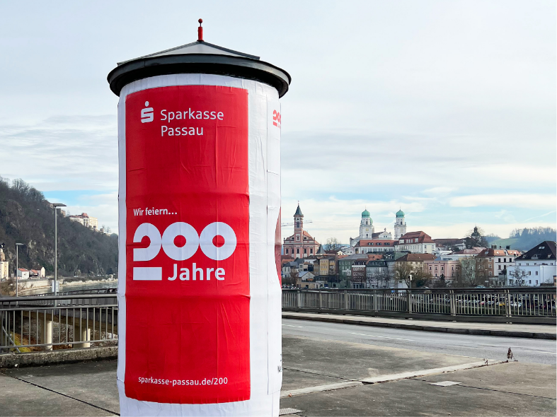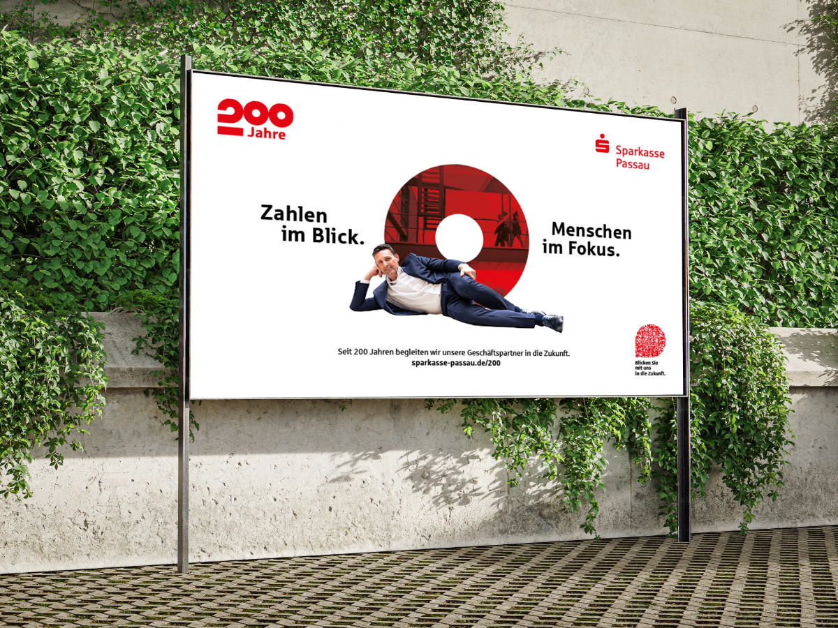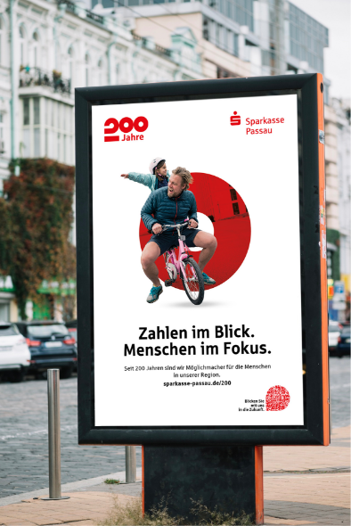 „200 Jahre Sparkasse Passau“ – Erscheinungsbild und Kampagne drehen sich um Menschen. Menschen mit unterschiedlichen Hintergründen, wie die Kunden und Mitarbeiter der Bank. Im Leitmotiv mit wechselnden Personen stehen sie im Mittelpunkt. Vertraute Orte im Hintergrund erzeugen ein Gefühl von Heimat als gemeinsame Vergangenheit und Ort der Zukunft. Die Kernbotschaft der Kampagne definierte die Sparkasse in den letzten 200 Jahren: „Zahlen im Blick. Menschen im Fokus“. Die Zahl „200“ verleiht dem Jubiläumslogo Stabilität und Dynamik zugleich. Der Punkt über dem Sparkassen-„S“ wird zur runden Form mit zusätzlichen Funktionen: Eine Linse für den Focus. Eine Projektionsfläche für Orte. Ein Fernglas für Weitsicht. Die Jubiläums-Kampagne umfasst eine Vielzahl aufeinander abgestimmter Einzelmaßnahmen: Vom Magazin bis zur Außenwerbung, vom Veranstaltungsevent bis zur Social-Media-Kampagne. Eine Kampagne mit hohem Integrations- und Identifikationspotenzial.