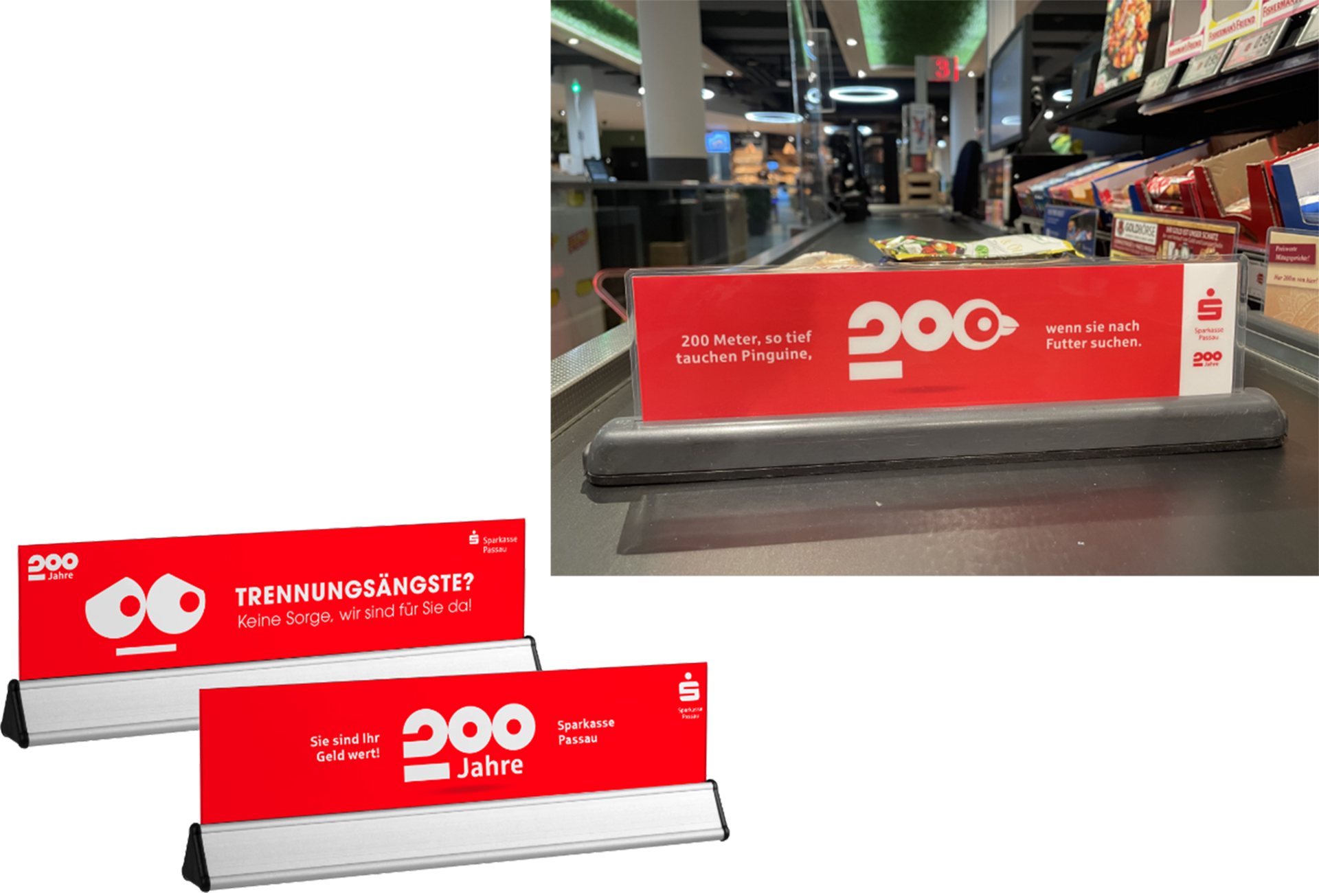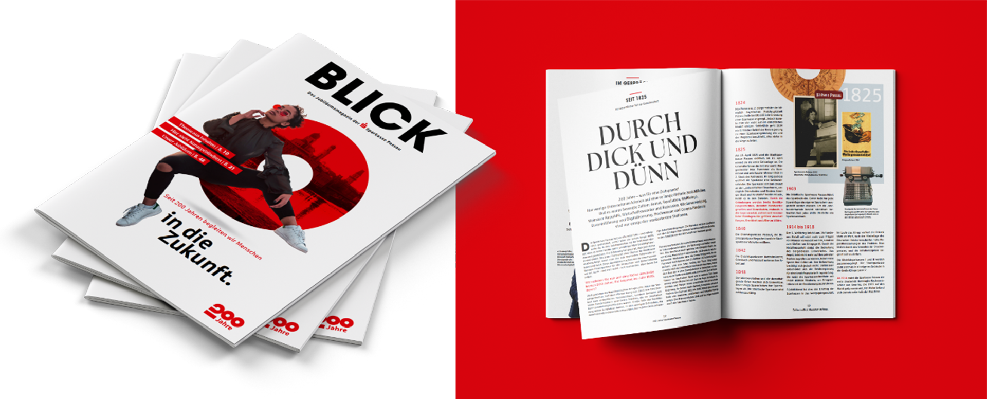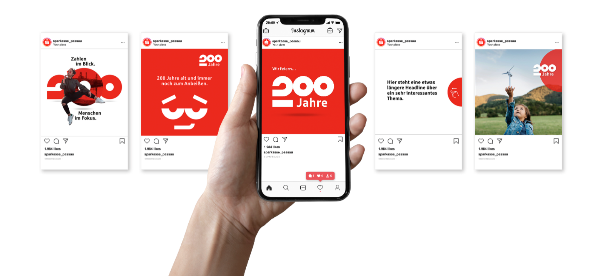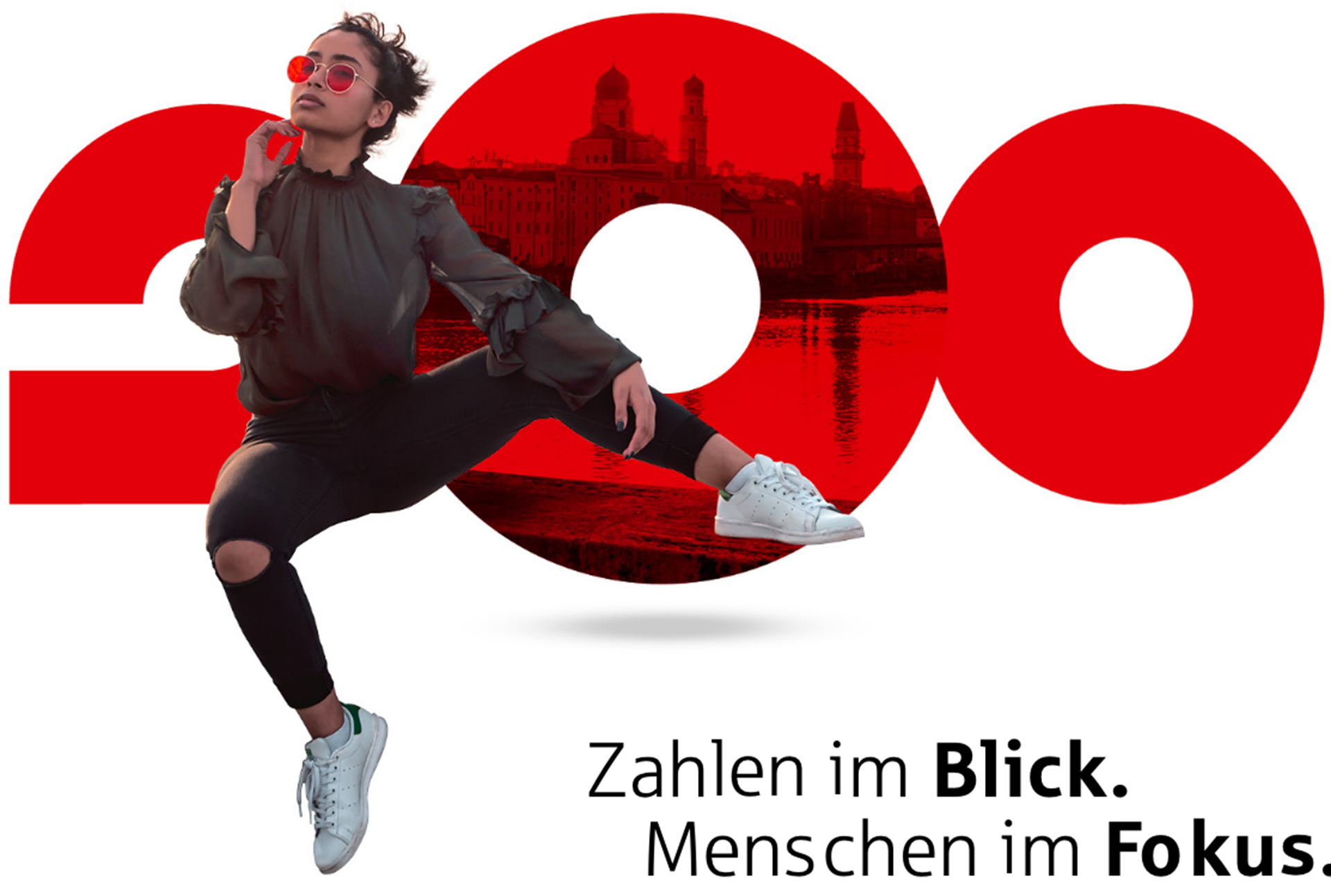 „200 Jahre Sparkasse Passau“ – Erscheinungsbild und Kampagne drehen sich um Menschen. Menschen mit unterschiedlichen Hintergründen, wie die Kunden und Mitarbeiter der Bank. Im Leitmotiv mit wechselnden Personen stehen sie im Mittelpunkt. Vertraute Orte im Hintergrund erzeugen ein Gefühl von Heimat als gemeinsame Vergangenheit und Ort der Zukunft. Die Kernbotschaft der Kampagne definierte die Sparkasse in den letzten 200 Jahren: „Zahlen im Blick. Menschen im Fokus“. Die Zahl „200“ verleiht dem Jubiläumslogo Stabilität und Dynamik zugleich. Der Punkt über dem Sparkassen-„S“ wird zur runden Form mit zusätzlichen Funktionen: Eine Linse für den Focus. Eine Projektionsfläche für Orte. Ein Fernglas für Weitsicht. Die Jubiläums-Kampagne umfasst eine Vielzahl aufeinander abgestimmter Einzelmaßnahmen: Vom Magazin bis zur Außenwerbung, vom Veranstaltungsevent bis zur Social-Media-Kampagne. Eine Kampagne mit hohem Integrations- und Identifikationspotenzial.